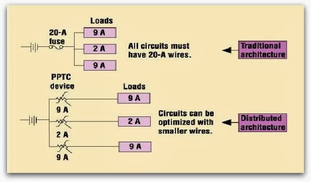 The conventional solution groups similar circuits together and protects them all with a single fuse. The fuse must be sized to carry the sum of the currents drawn by each of the protected loads; and, to limit risk of damage and fire, the wires feeding from the fuse to each load must be chosen according to the fuse size selected. This design practice often results in oversized wires with high current-carrying capability feeding loads that require relatively low currents. Using heavy-gauge wire also requires use of larger terminals and connectors, which further increases cost, size, and weight. It also increases harness weight, and the weight of the automobile, which has an effect on fuel efficiency.