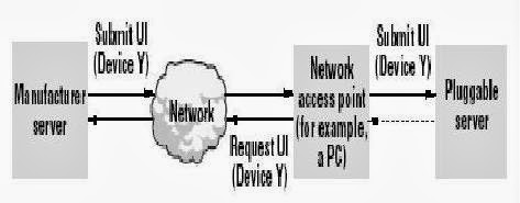 There are several ways to make things visible on the Web. In the simplest case, a server hosts an item's Web presence without a physical connection to the item. A handheld device reads links between the item and its Web presence, connects to the respective URL, and retrieves information about the item. A well-known example for this approach is the Cooltown Museum, 1 where small infrared transceivers are located close to the pictures. When coming close, the visitor's PDAs receive Web links that point to the information pages for the particular picture. Unfortunately, interacting with the item itself is impossible. Interaction with a device would be possible if the device had a wireless control interface to its internal logic. For example, the mobile terminal could download a device-specific user interface application from the Web and use it to control the device through a device-dependent protocol (see Figure A1). This approach might become feasible when we can download Java applications into mobile terminals with access to Bluetooth APIs.